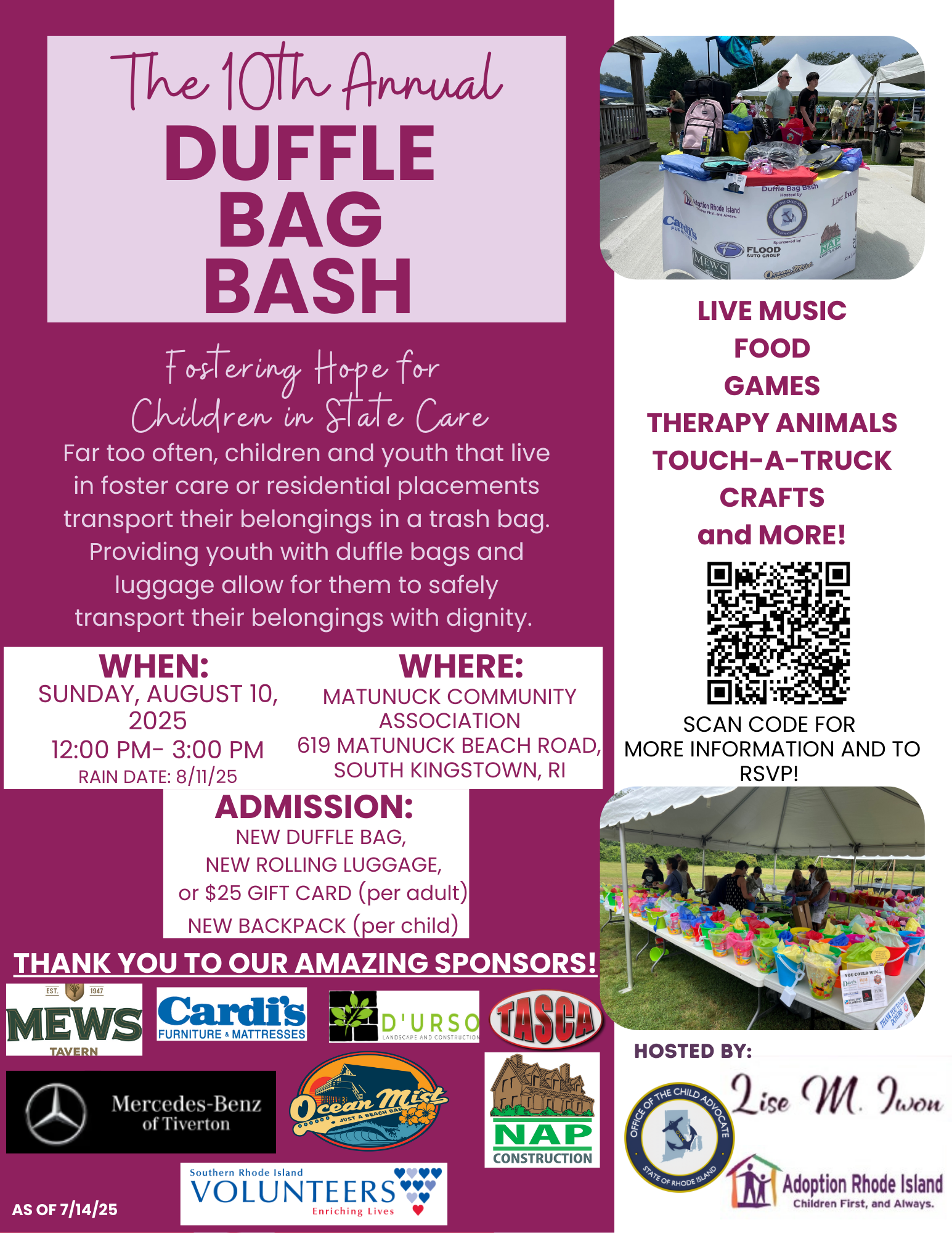 Adult Admission: One brand new rolling duffle bag or suitcase AND/OR $25 Gift Card.